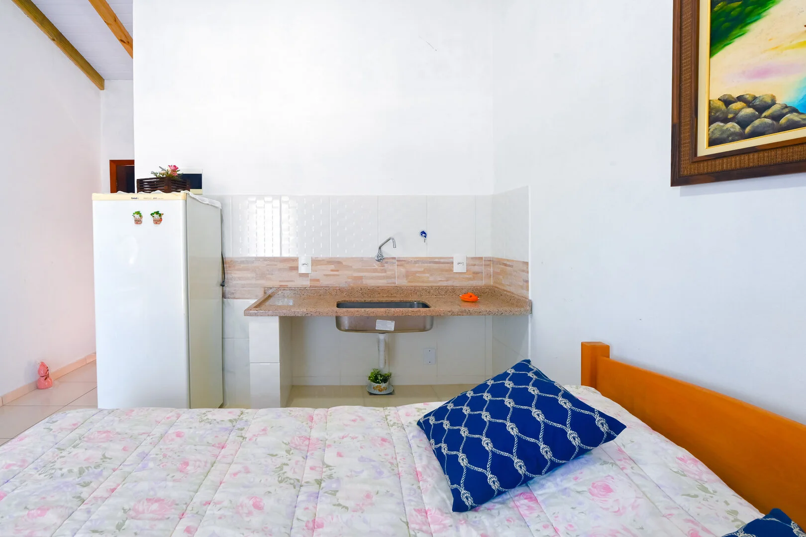 Suíte com cama de casal, TV, micro-ondas, geladeira e fogão cooktop, oferecendo praticidade e conforto em um ambiente acolhedor.