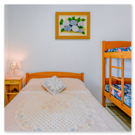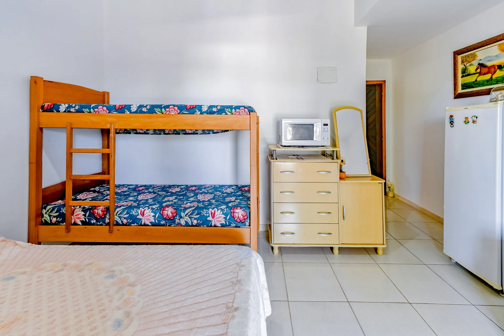 Acomodação versátil com cama de casal, beliche, cama de solteiro, TV, geladeira, micro-ondas e fogão cooktop, ideal para grupos ou famílias.